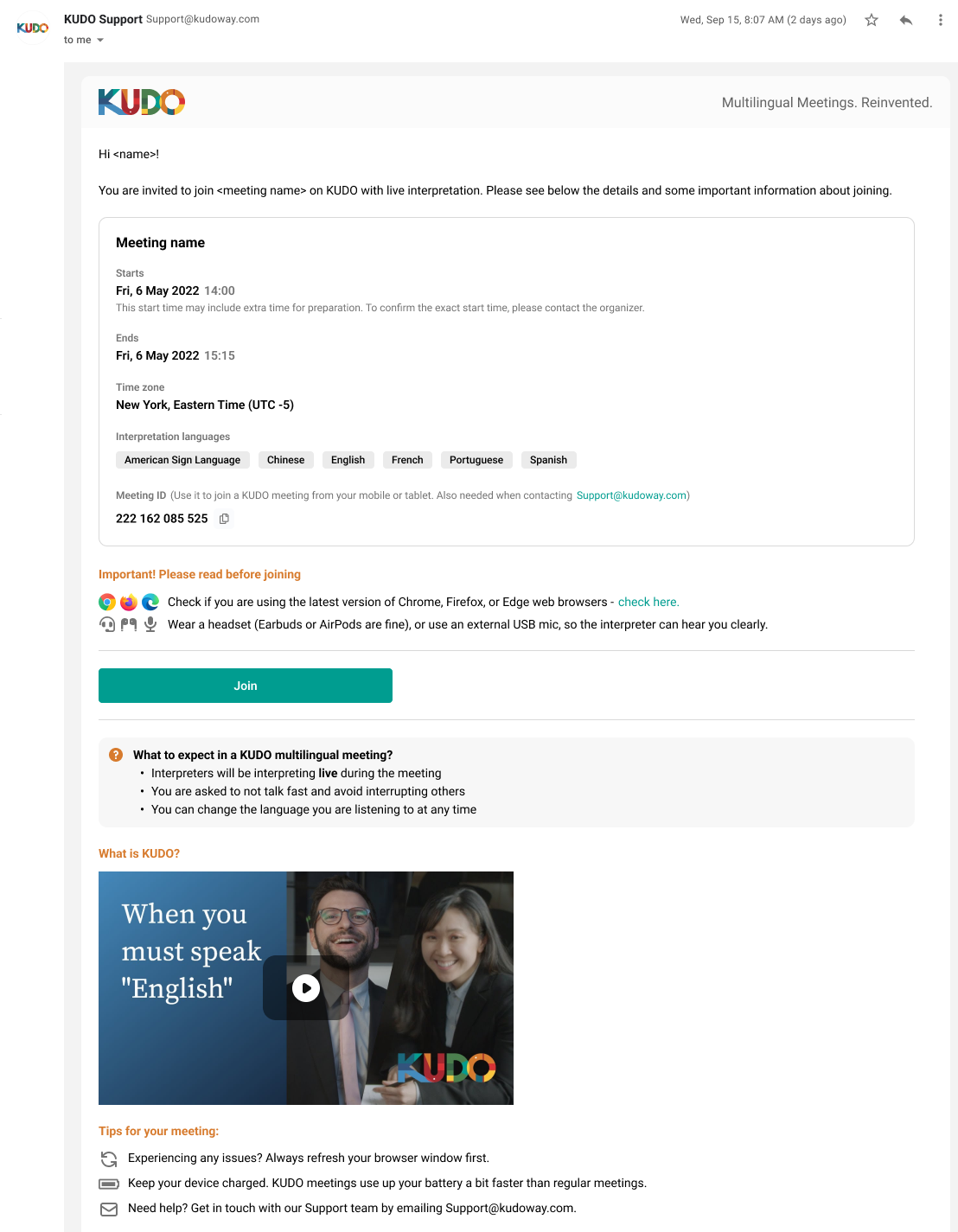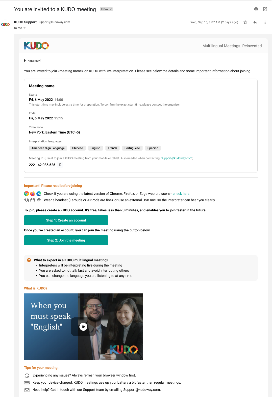 A “What to expect” section to guide first-time participants through how a KUDO meeting with live interpretation works, supported by a short explainer video.