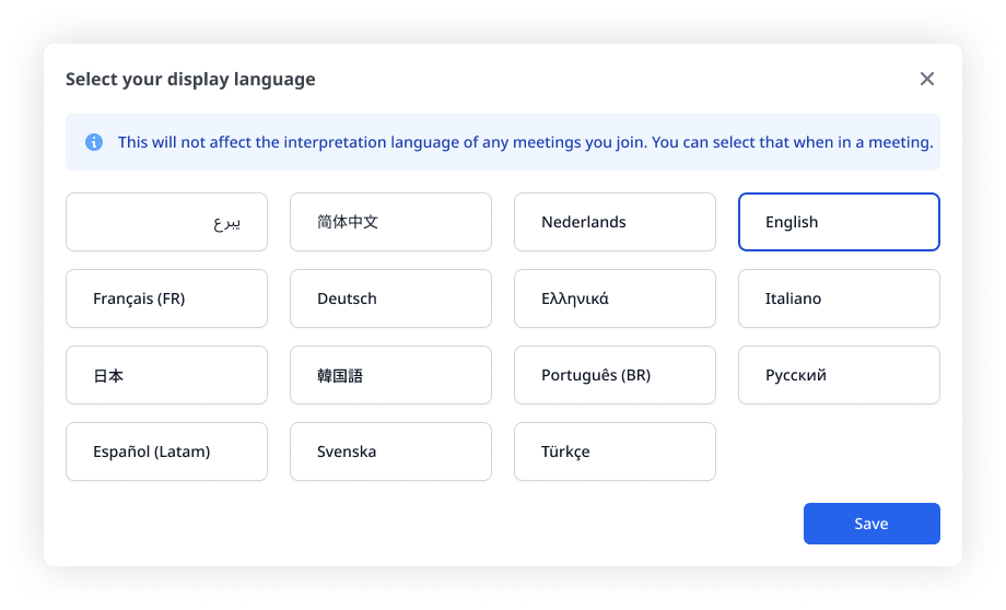 The copy for this modal needed to address a common point of confusion: participants often misunderstood that the display language is not the same as the interpretation language, which they can select only after joining a KUDO meeting.